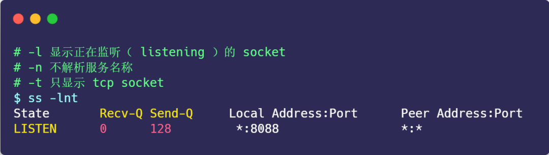 的 TCP 连接;Send-Q:accept 队列最大长度,上面的输出结果说明监听 8088 端口的 TCP 服务,accept 队列的最大长度为 128;