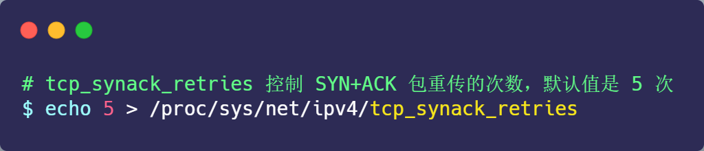 当网络繁忙、不稳定时,报文丢失就会变严重,此时应该调大重发次数。反之则可以调小重发次数。修改重发次数的方法是,调整 tcp_synack_retries 参数: