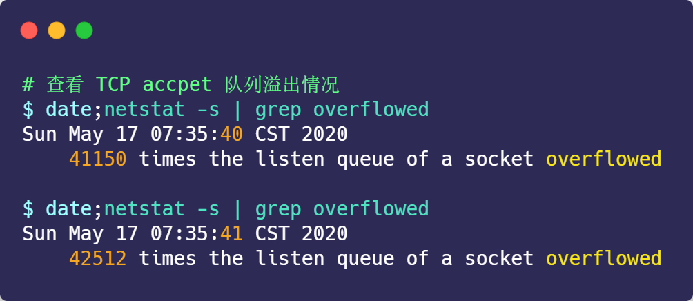上面看到的 41150 times ,表示 accept 队列溢出的次数,注意这个是累计值。可以隔几秒钟执行下,如果这个数字一直在增加的话,说明 accept 连接队列偶尔满了。
