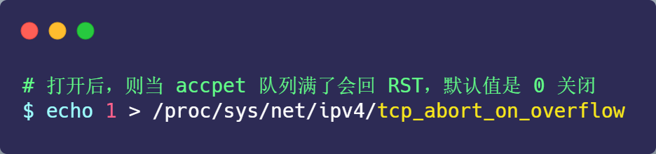 所以,tcp_abort_on_overflow 设为 0 可以提高连接建立的成功率,只有你非常肯定 TCP 全连接队列会长期溢出时,才能设置为 1 以尽快通知客户端。