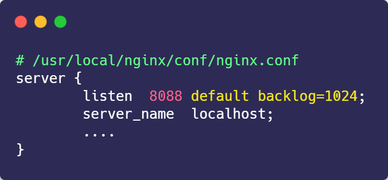 增大 backlog 的方式,每个 Web 服务都不同,比如 Nginx 增大 backlog 的方法如下: