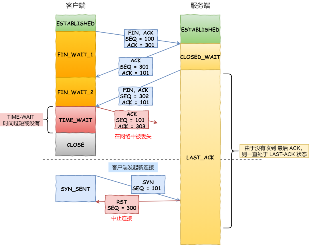 服务器端连接成功建立的时间还要再往后,等到服务端收到客户端的 ACK 后,服务端的连接状态才变为 ESTABLISHED。