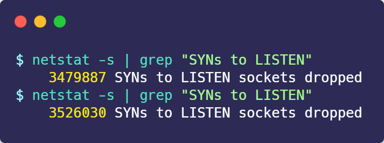 上面输出的数值是累计值,表示共有多少个 TCP 连接因为半连接队列溢出而被丢弃。隔几秒执行几次,如果有上升的趋势,说明当前存在半连接队列溢出的现象。
