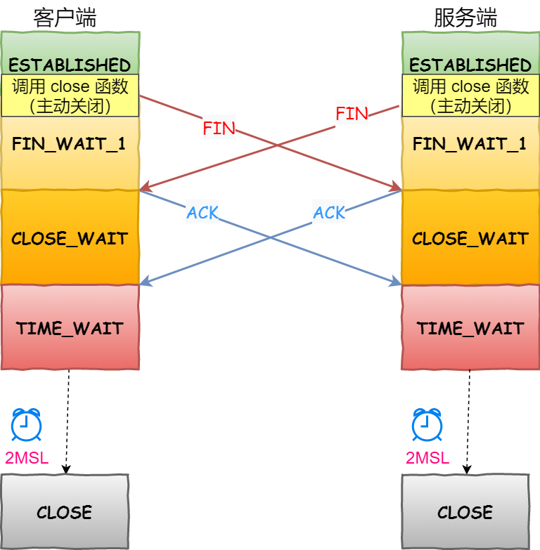 被动关闭的连接方应对非常简单,它在回复 ACK 后就进入了 CLOSE_WAIT 状态,等待进程调用 close 函数关闭连接。因此,出现大量 CLOSE_WAIT 状态的连接时,应当从应用程序中找问题。